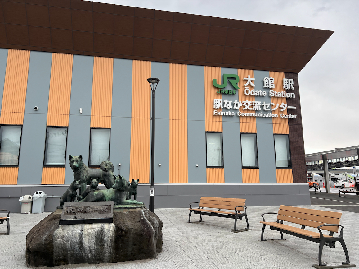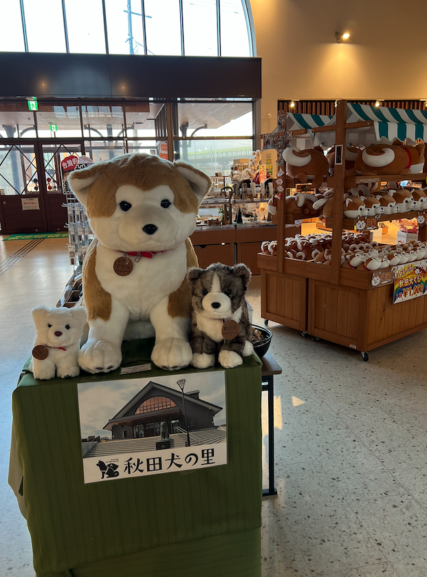 孔代さんの叔母さんとは、高校時代からの友人で、テニス部で絆を深めた仲間。なので私も親戚のおばさんのような感覚です。帰りは、大館から電車に乗ることにしたので、孔代さんが大館駅まで送ってくれました。駅前に「秋田犬の里」という、秋田犬を紹介した施設があり入ってみました。そこで大館で花屋を営んでいるテニス部の先輩に会うという思わぬ奇跡の出会いがあったのです!!これにはおたがいびっくりです!!運良く一昨年テニス部のメンバーが、高校以来集まる機会があり、その時出会ってなければ、今回気がつかなかったはずです。先輩はとても喜んで、秋田犬のぬいぐるみを記念に買ってくださいました。