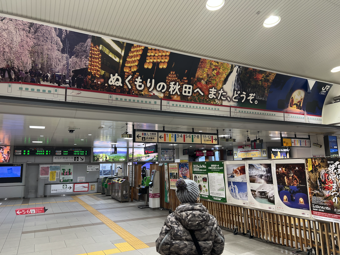 2日目は、大館の早口(はやぐち)で「yourwear(ユアウエア)」https://yourwear.jpというニットブランドを展開している佐藤孔代(みちよ)さんを奥羽線に乗って訪ねることにしました。朝の秋田駅は、クマ騒動のせいか、クリスマスシーズンなのに閑散としていて・・・とはいえナマハゲ、竿燈などの秋田を代表する観光アピールを楽しみました!